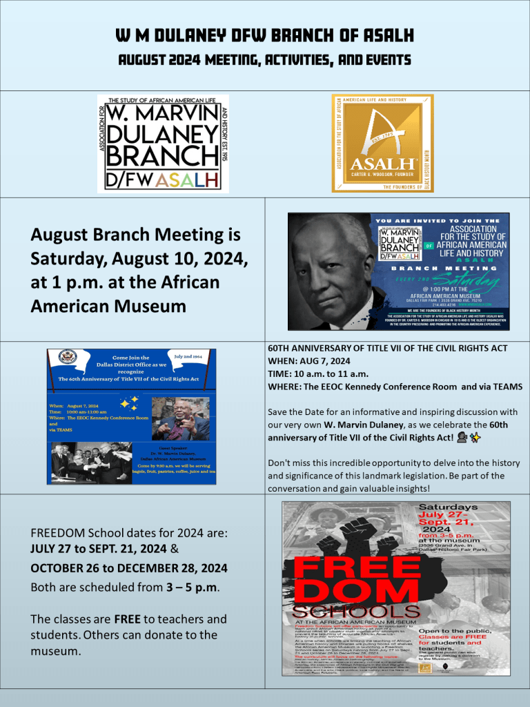 WM Dulaney ASALH Branch in partnership with the African American Museum of Dallas is holding Freedom Schools at the museum in Dallas. The schools will offer participants an opportunity to learn about African American history as part of a national effort to counter state legislatures’ attempts to prevent the teaching of accurate African American history in public schools.