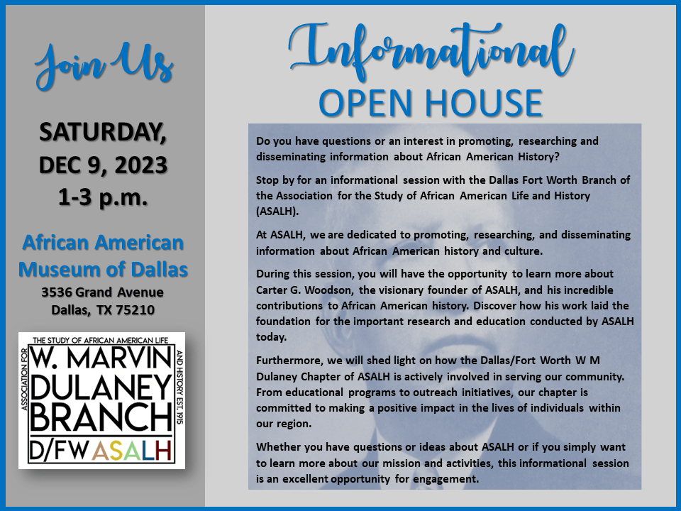 Stop by for an informational session with the Dallas Fort Worth Branch of the Association for the Study of African American Life and History (ASALH).