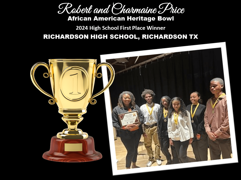 It is with great pride and joy that we announce the High School and Middle School winners of the 2024 Robert and Charmaine Price African American Heritage Bowl. Despite the challenges faced, the spirit of competition and knowledge prevailed as teams showcased their intellect and passion for African American heritage.